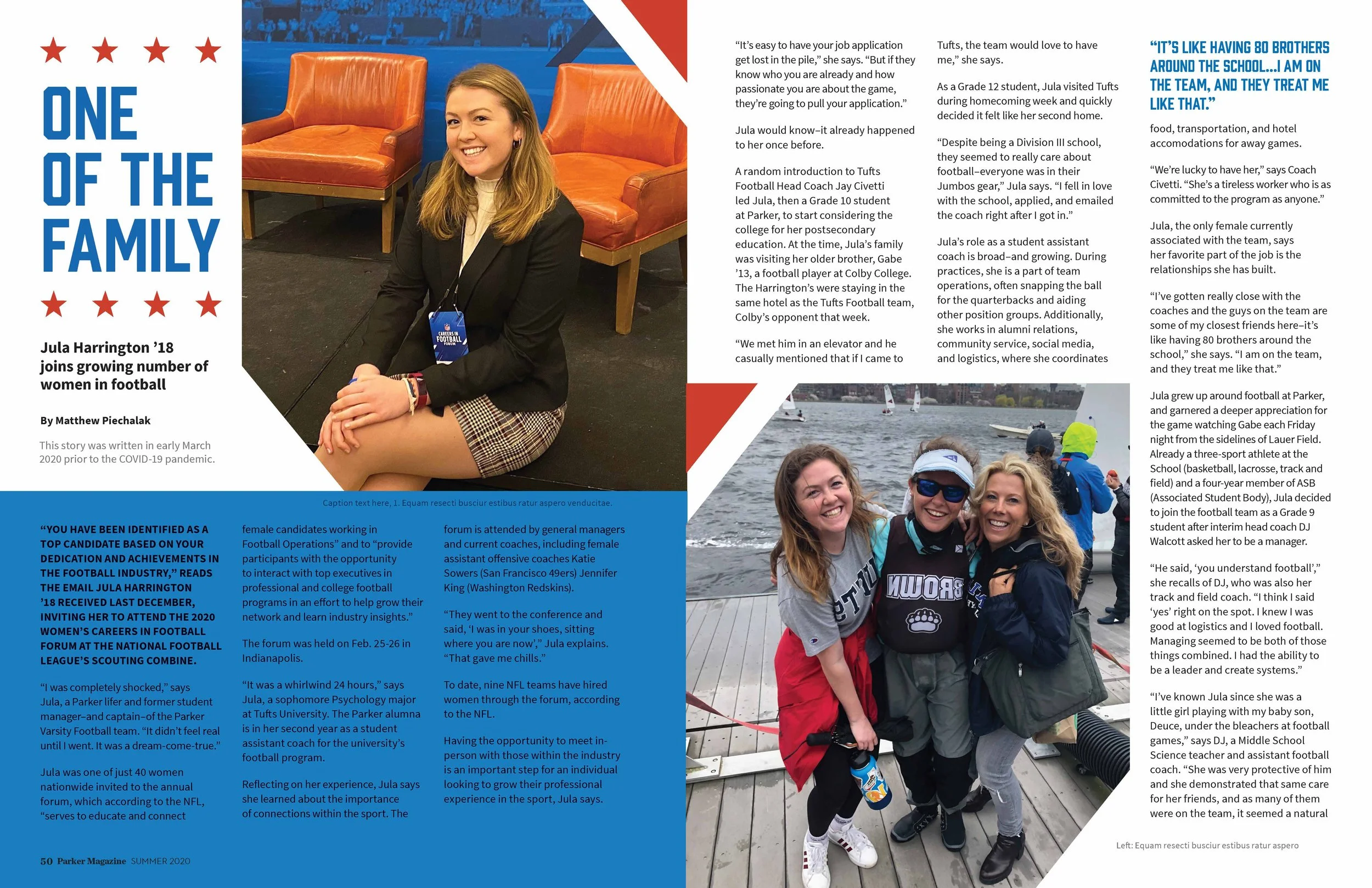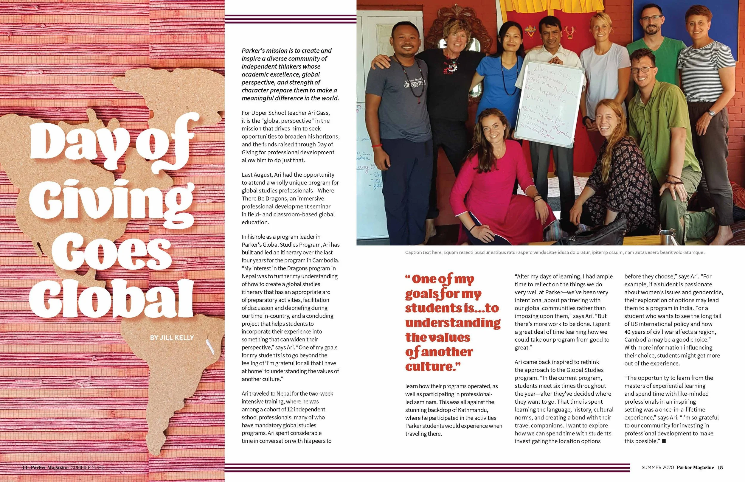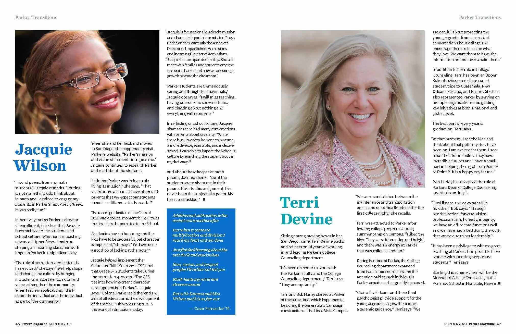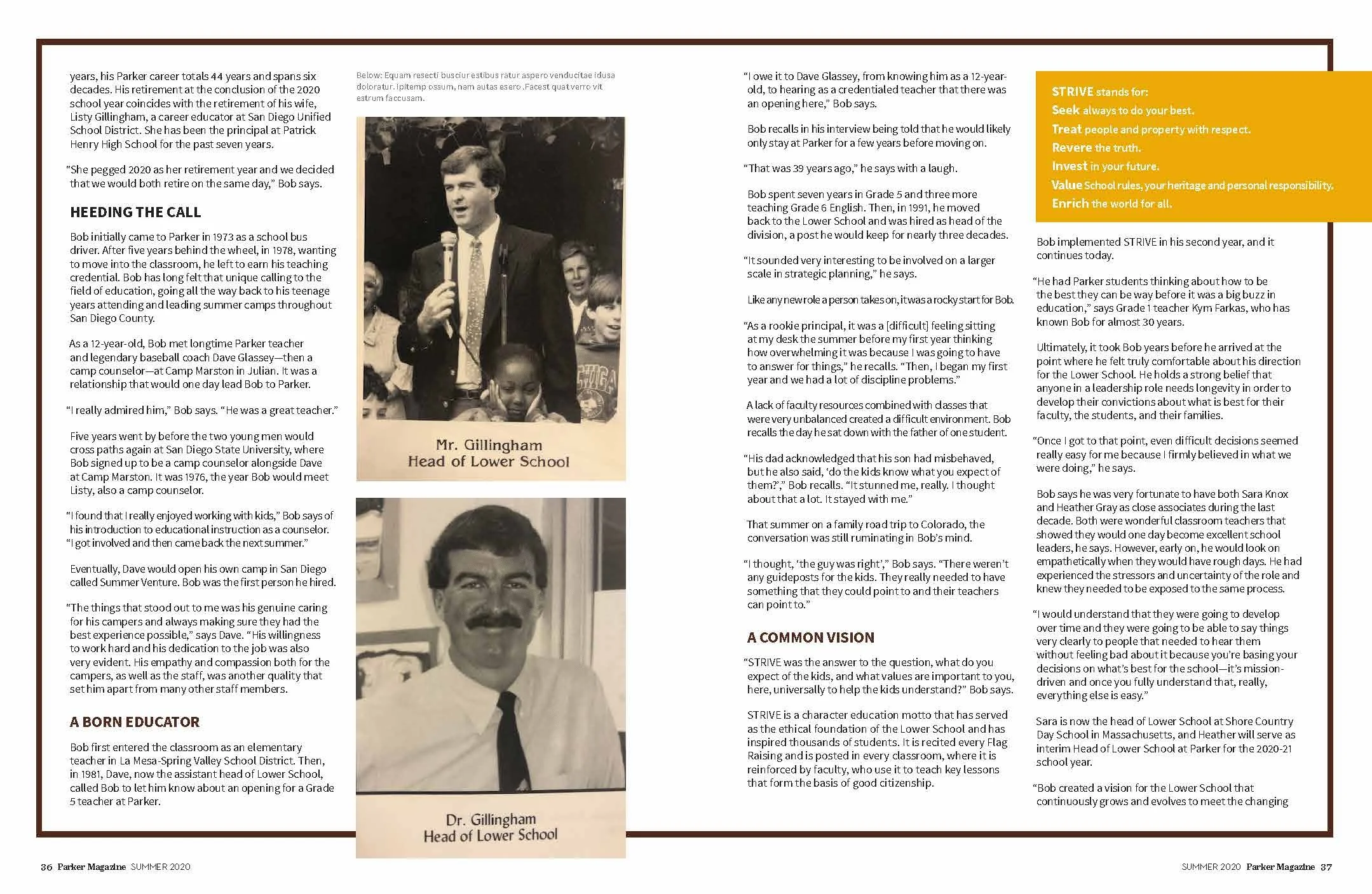 Magazine Layout and DesignFreelance design work for The Parker School’s Summer 2020 magazine. Spreads designed using article drafts and placeholders for final copy by The Parker School’s team.